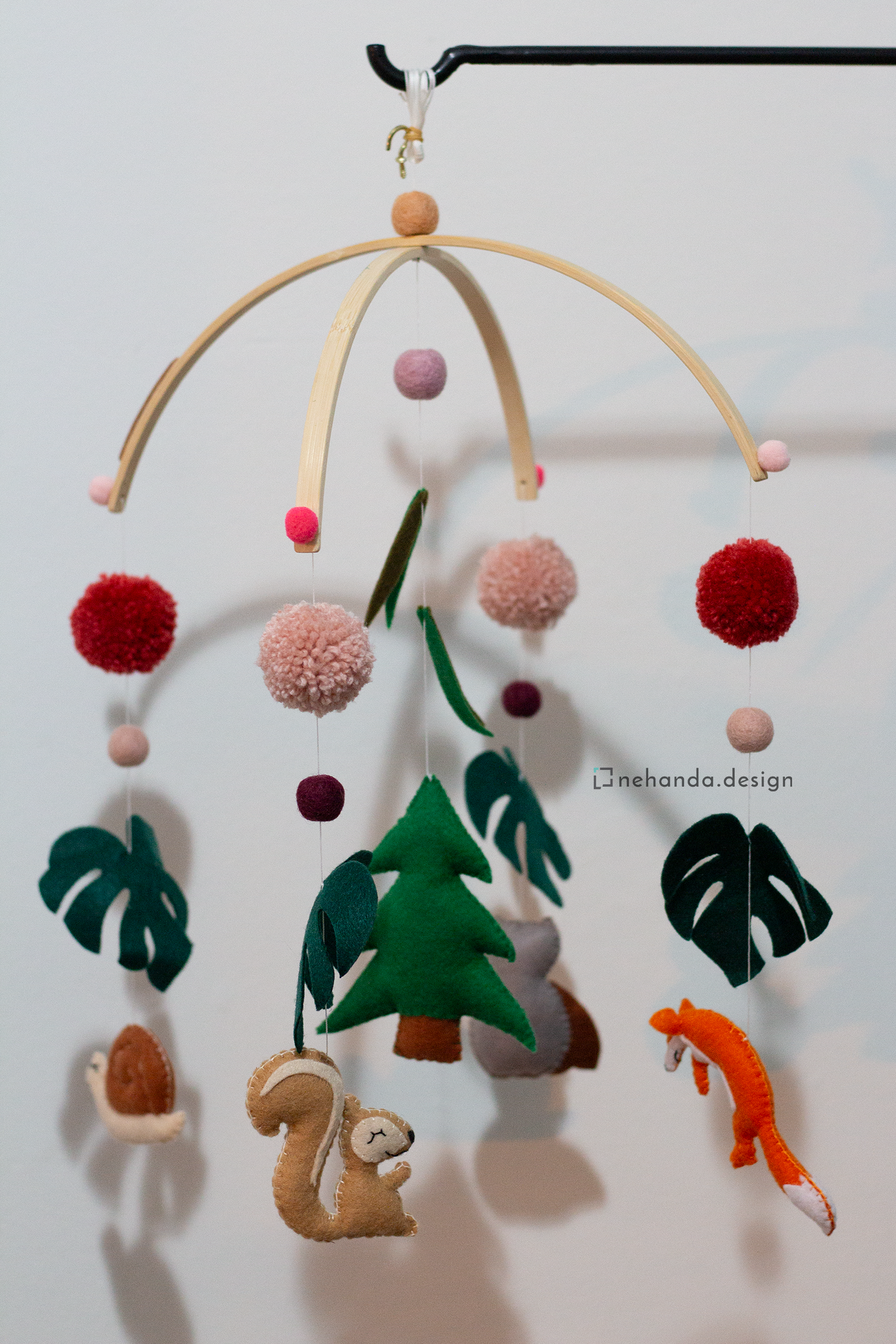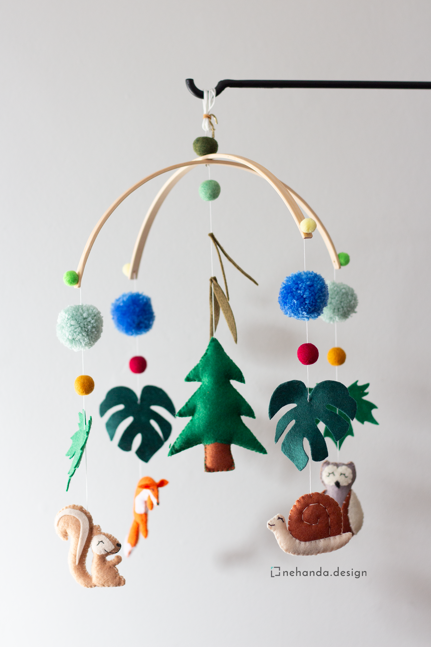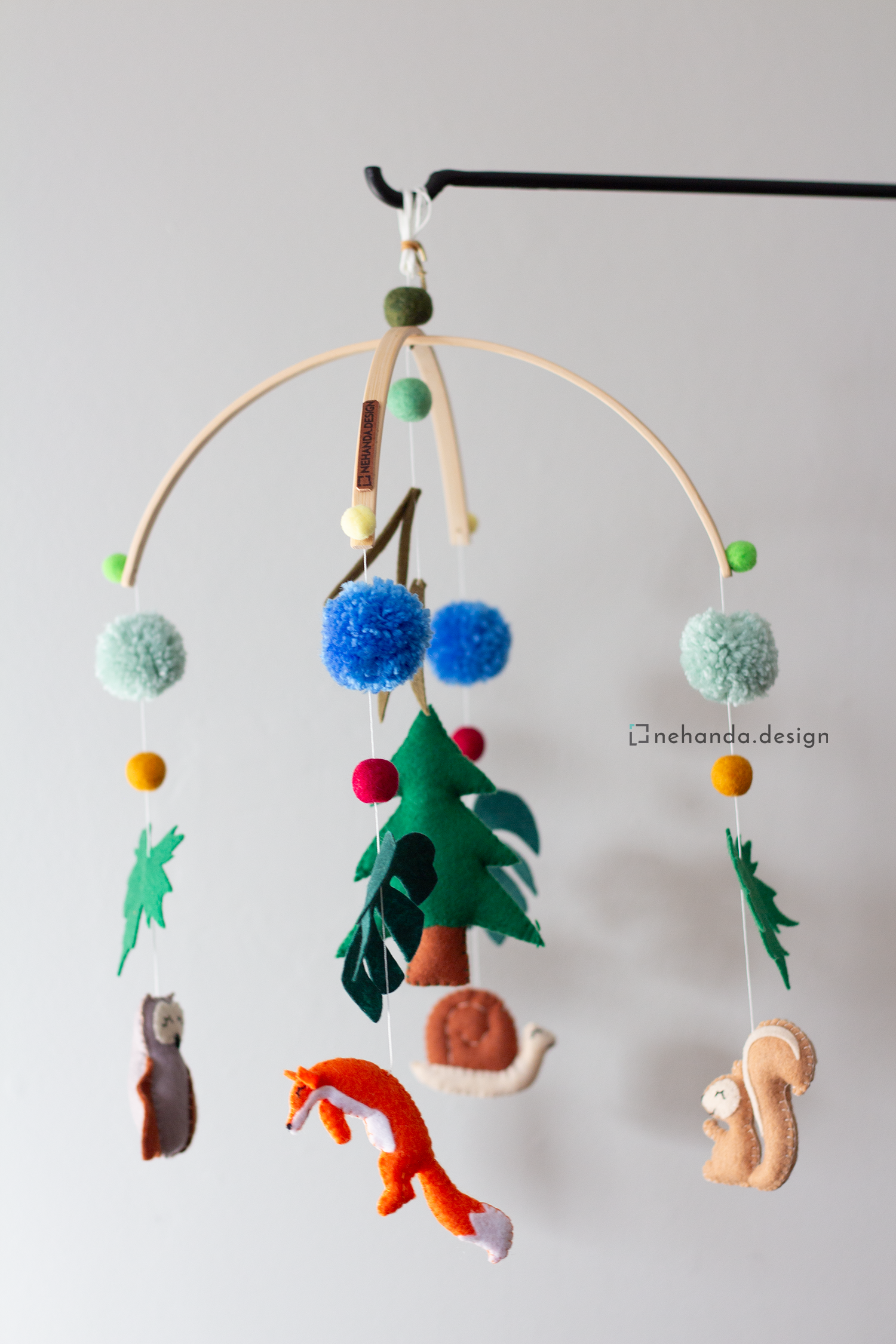Inspired by the peaceful beauty of the woodlands, the Forest Life V1 Nursery Mobile adds a gentle, nature-filled atmosphere to your baby's space. At its center, a pine tree is surrounded by your choice of handcrafted forest creatures—such as owls, foxes, squirrels, or snails—along with pom-poms, foliage, and soft felt balls to complete the woodland scene.